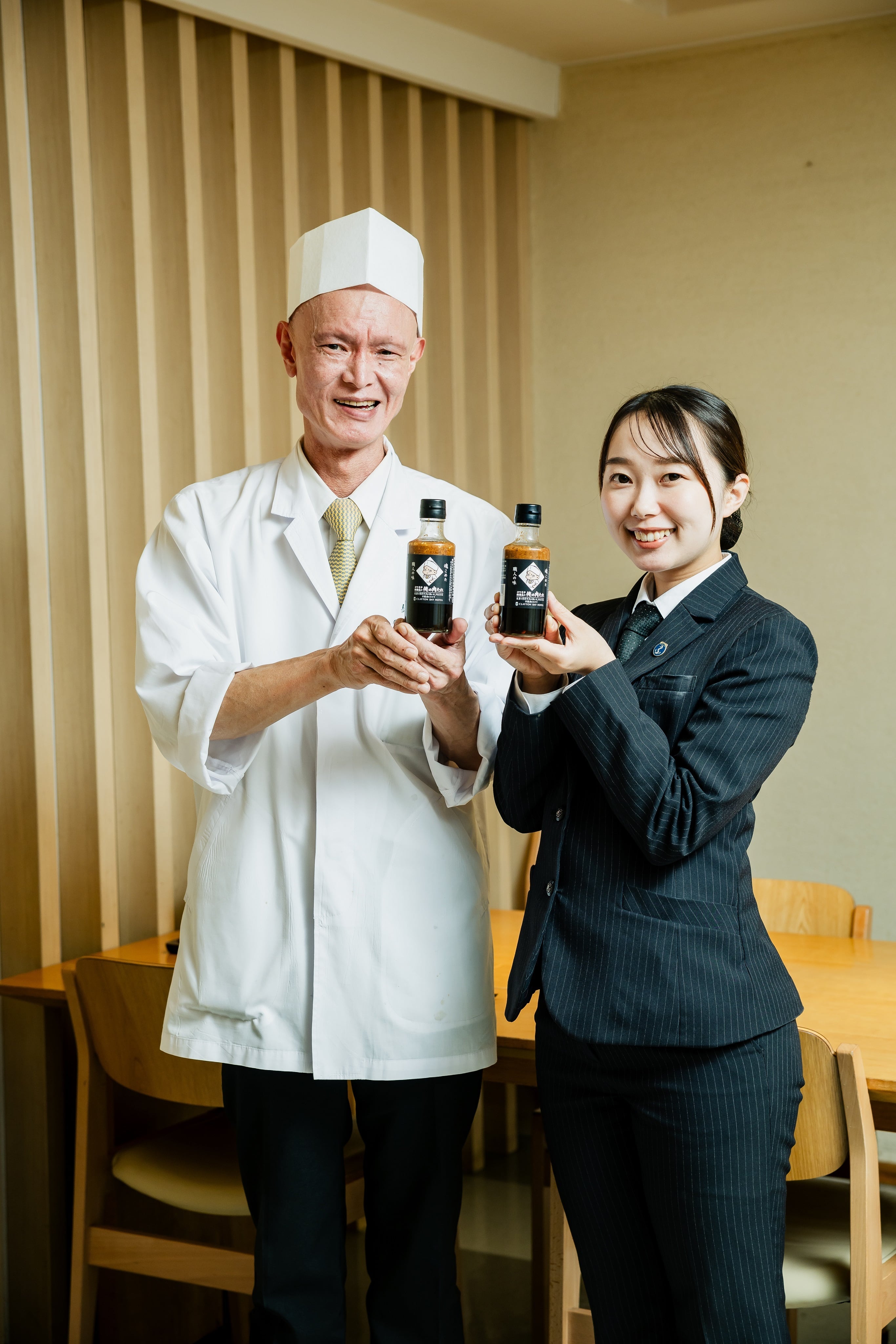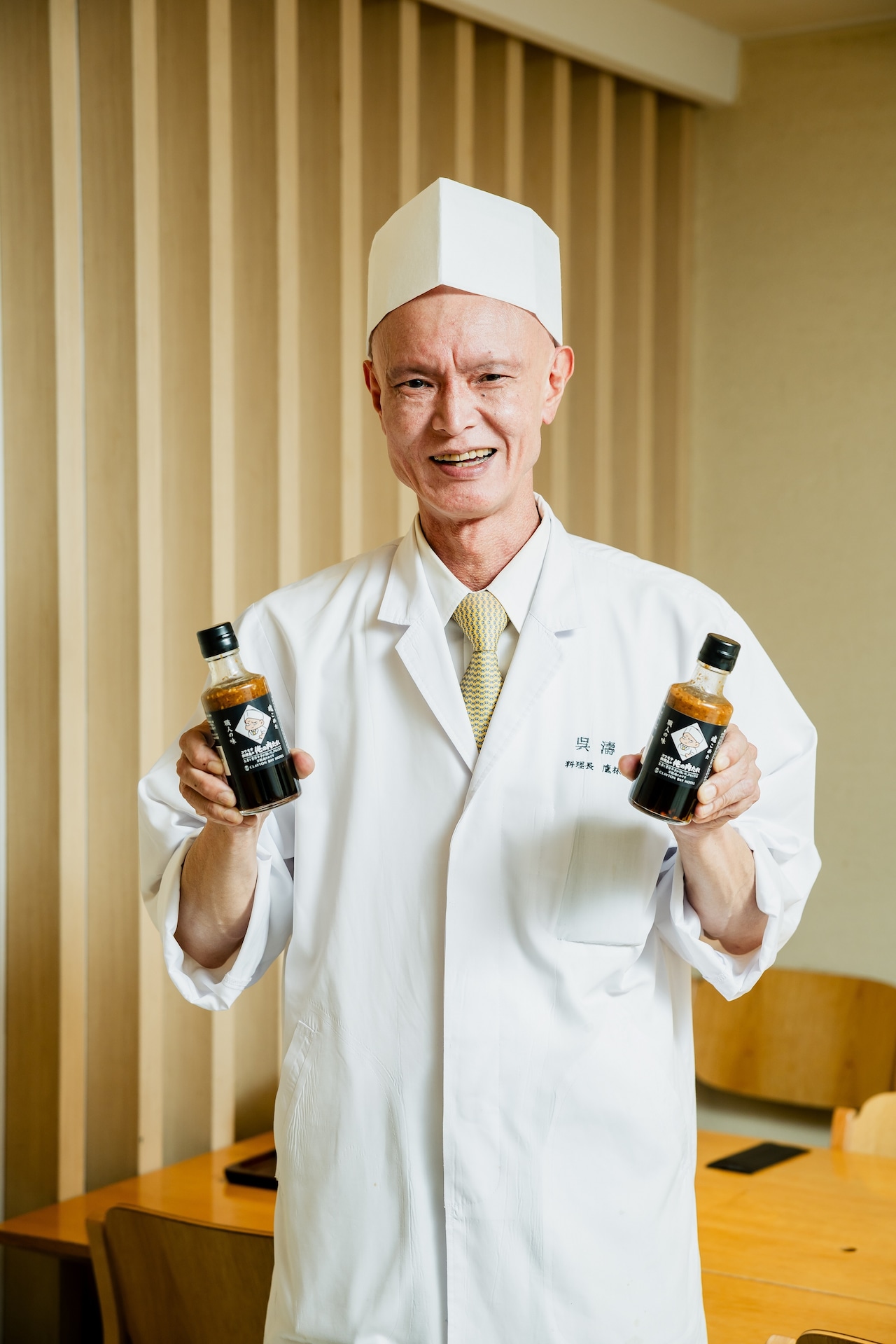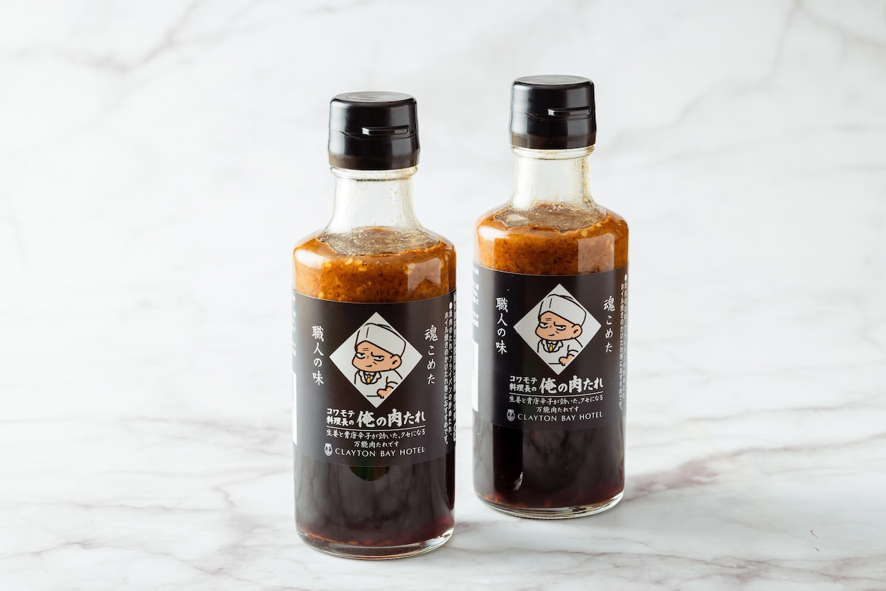 日本料理・呉濤の鷹林料理長(コワモテ料理長)による新商品「俺の肉たれ」です。俺の肉たれですが、「つけてよし」「かけてよし」「炒めてよし」の万能肉たれとなってます。生姜や青唐辛子をベースにパンチがある肉たれに仕上がっています。肉たれのラベルに表示されているイラストですが、新入社員のららちゃんが描いたコワモテ料理長の似顔絵となっております。ご家庭の食卓に、お酒のアテ作りにお楽しみください。