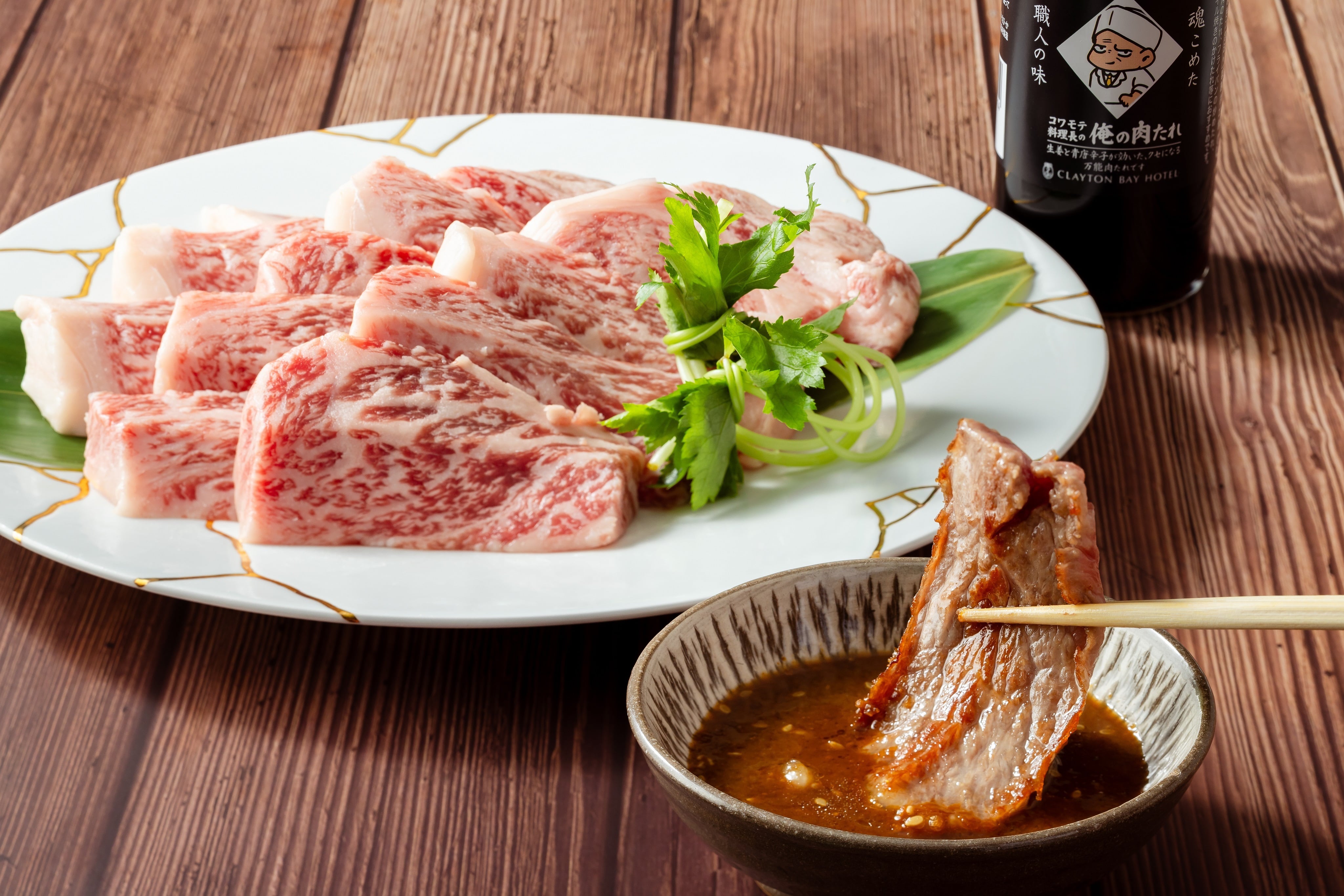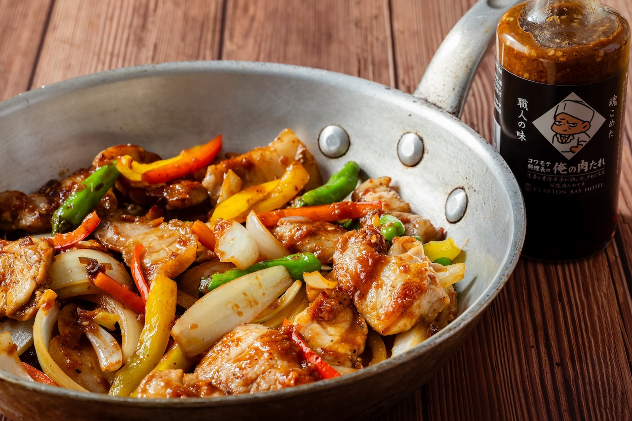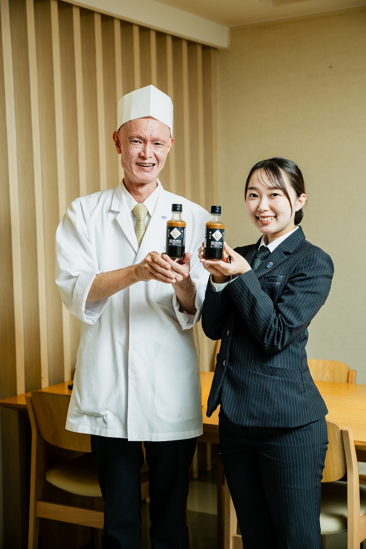 日本料理・呉濤の鷹林料理長(コワモテ料理長)による新商品「俺の肉たれ」です。俺の肉たれですが、「つけてよし」「かけてよし」「炒めてよし」の万能肉たれとなってます。生姜や青唐辛子をベースにパンチがある肉たれに仕上がっています。肉たれのラベルに表示されているイラストですが、新入社員のららちゃんが描いたコワモテ料理長の似顔絵となっております。ご家庭の食卓に、お酒のアテ作りにお楽しみください。